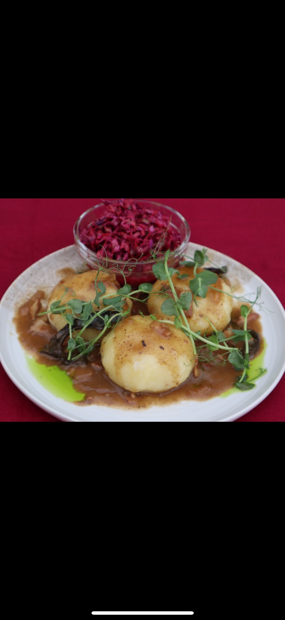 (kluskami śląskimi) i surówką z pieczonych buraków